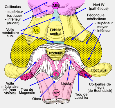 Il ne faut pas oublier que les pédoncules cérébelleux inférieurs sont en prolongement direct des cordons dorsaux bulbaires et forment donc les bords latéraux inférieurs de ce ventricule (non visibles sur les figures).