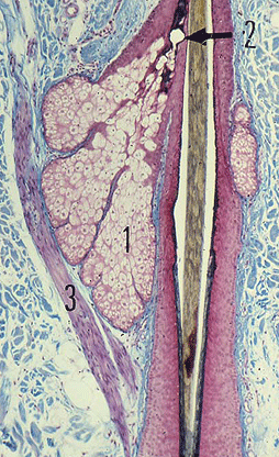 Il s'attache à la gaine du follicule, à peu près au milieu, et forme un angle aigu dans lequel se trouve la glande sébacée.