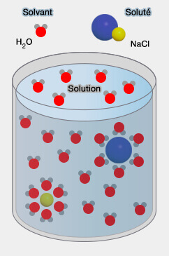Les solutés sont les espèces chimiques minoritaires dissoutes dans le solvant (exemple : solution de chlorure de sodium isotonique à 9 ‰).