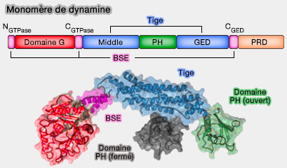 le domaine PH, retrouvé dans la pleckstrine, protéine des plaquettes, qui se lie au PI(4,5)P2 ou PIP2 membranaire, et régule aussi, par ses boucles hydrophobes, l'autoassemblage et la fission, comme le fait l'insert B de Drp1.