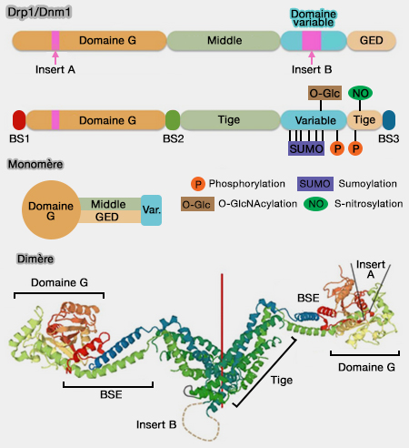 2. OPA1, comme les protéines de fission (dynamine et Drp1) contient un domaine " middle " et un domaine GED connectés par une région polypeptidique intrinsèquement désordonnée qui rappelle l'insert B Drp1.