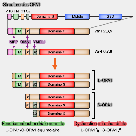 L'OPA1, dans sa version longue (L-OPA1), ancré dans le domaine transmembranaire et reliant les deux surfaces mitochondriales internes, permettrait la fusion par des interactions membranaires secondaires régulées par le domaine variable.