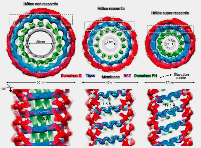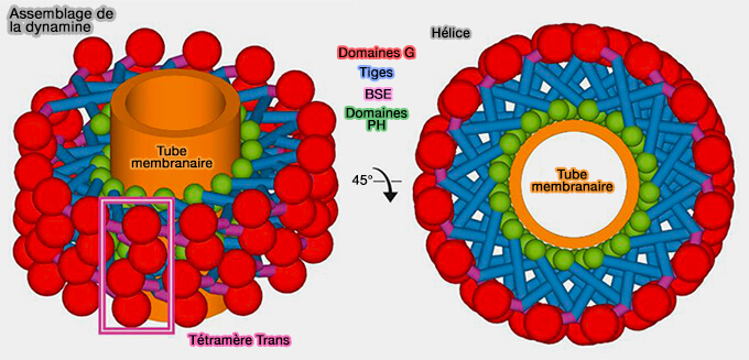 - Suite à plusieurs cycles d'hydrolyse du GTP, les spires adjacentes (rung, barreau) glisseraient les unes sur les autres, resserrant activement l'hélice et son tube membranaire jusqu'à ce que ces dernières fissions le ferment complètement.