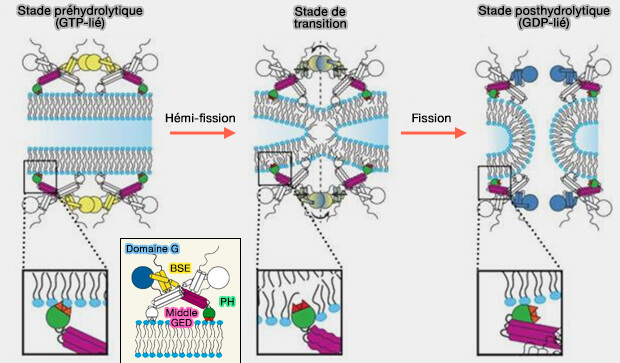 - Soit, une fois la fission survenue, la dynamine pourrait se démonter car le gabarit de la membrane a disparu.