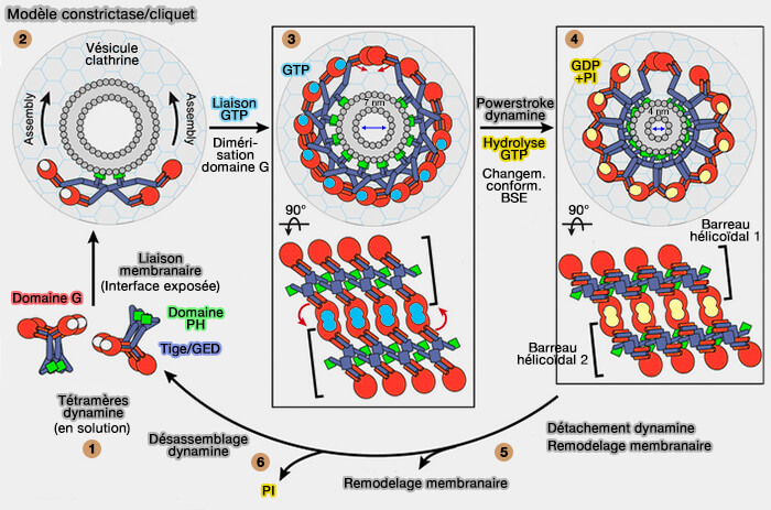 1. Dans ce modèle, les domaines GTPase, qui relient la dynamine par des interactions directes, pourraient agir comme des moteurs moléculaires.