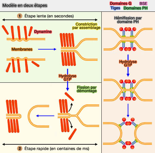 Ces deux modèles opposés ne sont pas forcément incompatibles, mais un plus grand nombre de données est nécessaire sur la manière dont le cycle GTPase de la dynamine est couplé aux activités (assemblage/désassemblage, interactions membranaires, dimérisation du domaine G, changements conformationnels…) qui conduisent à la fission (discussion).