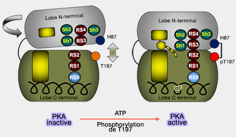 La conformation de la PKA est fermée par une liaison entre His87 et pThr197 de la boucle d'activation.