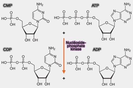 2. La nucléoside-diphosphate kinase ou NDPK (EC 2.7.4.6) catalyse le deuxième transfert d'un groupe phosphate que ce soit pour les nucléotides puriques ou pyrimidiques, qu'ils soient ribosiques ou
