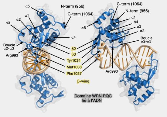 - l'ouverture directe de l'ADN par une boucle spécifique (β-wing), entre les brins β2 et β3 (Structural Basis for DNA Strand Separation by the Unconventional Winged-Helix Domain of RecQ Helicase WRN 2010).