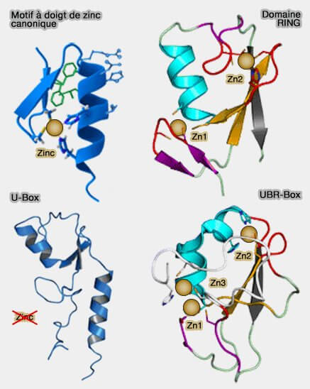 - les domaines UBP (The Ubiquitin Binding Domain ZnF UBP Recognizes the C-Terminal Diglycine Motif of Unanchored Ubiquitin 2006),