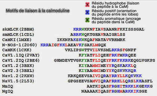 1. La présence de résidus hydrophobes volumineux (F, I, L, V et W), à la première et dernière position de ces motifs, appelés aussi " ancres ", est indispensable pour ancrer la protéine aux deux lobes de la CaM. (Calcium-induced exposure of a hydrophobic surface on calmodulin 1980).