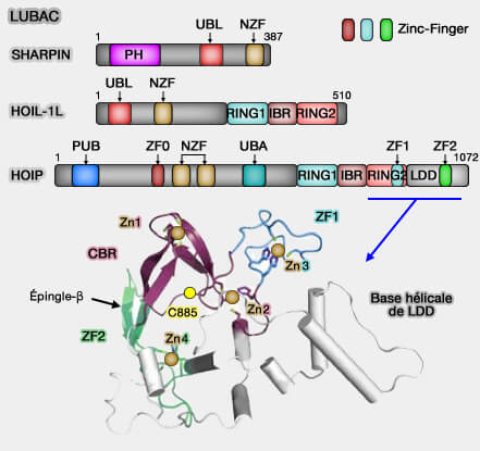 3. Le domaine LDD (Linear ubiquitin chain Determining Domain) de HOIP constitue l’élément catalytique terminal du complexe LUBAC, essentiel à la formation des chaînes linéaires d’ubiquitine (Structural basis for ubiquitylation by HOIL-1 2023).