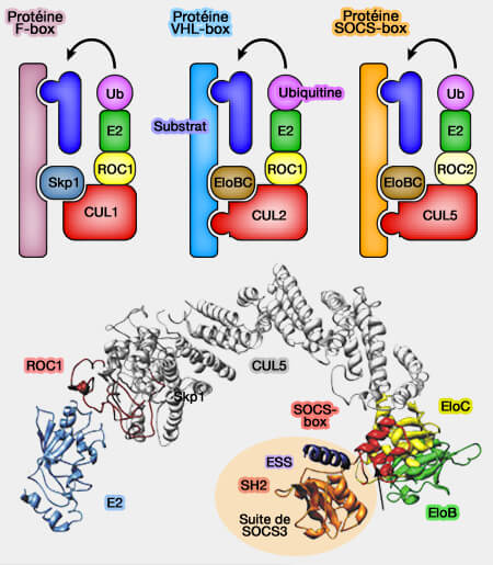 - des adaptateurs variables, i.e. Skp1, élongines, BTB, DDB1… assurant la reconnaissance du substrat.