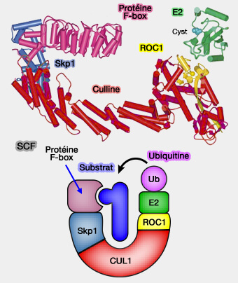 a. Ce système modulaire permet de constituer de multiples complexes CRL parmi lesquels le complexe SCF (Skp1-Cullin1-F-box), pivot de la dégradation régulée des protéines du cycle cellulaire.