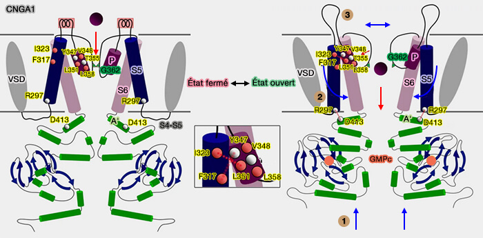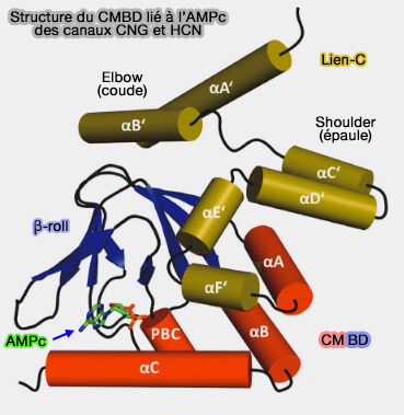 1. Le site de liaison du nucléotide cyclique ( domaine CNBD : Cyclic nucleotide-binding domain), i.e. l'AMPc pour les récepteurs olfactifs, GMPc pour les photorécepteurs, est classique et retrouvé dans d'autres protéines.