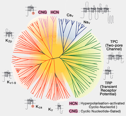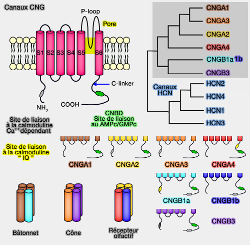 Les canaux CNG, formés de 4 sous-unités, ont d'abord été trouvés dans les photorécepteurs, puis dans les cellules olfactives, et enfin dans d'autres cellules nerveuses ou non.