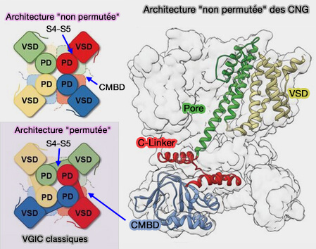 Bien que possédant un capteur de tension, les canaux CNG ne sont pas bloqués par la tension, une propriété essentielle pour une phototransduction et une transduction olfactive appropriées.