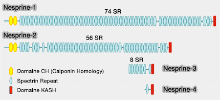 Chez les mammifères, les protéines KASH sont appelées nesprines (Nuclear envelope spectrin-repeat proteins) et sont encodées par 5 gènes (SYNE - SYnaptic Nuclear Envelope protein -) qui génèrent des isoformes multiples par épissage alternatif de l'ARN (Nesprins: from the nuclear envelope and beyond 2013).