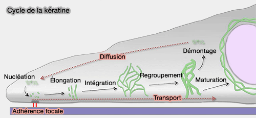 Pour la kératine, l'association des oligomères solubles (nucléation) est effectuée à la périphérie cellulaire dans le maillage d'actine ou à proximité des adhérences focales. Les particules s'accroissent (élongation) en se déplaçant vers le centre de la cellule (transport par un processus actine-dépendant) et les filaments s'incorporent au réseau existant (intégration).