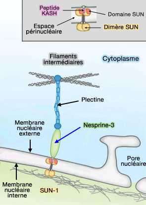 3. La nesprine-3 est la seule nesprine à se lier indirectement aux filaments intermédiaires par le biais de la plectine (Nesprin-3: a versatile connector between the nucleus and the cytoskeleton 2011 et Nesprin interchain associations control nuclear size 2012).