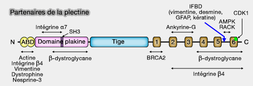 La plectine, protéine géante, est retrouvée dans tous les tissus, et en particulier elle fait le lien entre les filaments intermédiaires et (Plectin isoforms as organizers of intermediate filament cytoarchitecture 2011) :