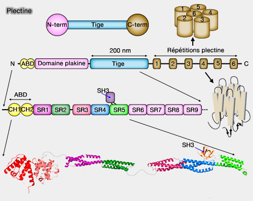 3. six domaines PRD (Plectine Repeat Domain ou PLEC domain de 300 résidus environ, M1 à M6et ) C-terminaux, semblable aux répétitions ankyrine - ankyrin-like repeat domains - formant un solénoïde (Plectin repeats and modules: strategic cysteines and their presumed impact on cytolinker functions 2001).