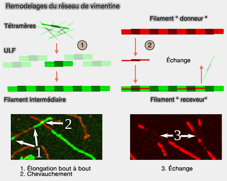 Ainsi, les filaments ne s'accroissent pas seulement par leurs extrémités, mais aussi par incorporation d'ULF dans le filament même. Il en de même pour leur dissociation. Ce processus n'est pas homogène et est appelé " dynamic subunit exchange " : des ULF peuvent se détacher d'un filament et entrer dans le pool pour être incorporés à un autre filament (Direct Observation of Subunit Exchange along Mature Vimentin Intermediate Filaments 2014).