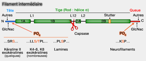 Les modifications post-traductionnelles (phosphorylation et glycosylation, entre autres) de la tête et la queue joueraient un rôle important dans le remodelage des filaments intermédiaires.