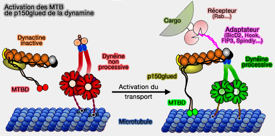 Toutefois, l'activation par l'adaptateur pourrait permette l'attachement des MTBD (Microtubule Binding Domain) de la dynactine sur les microtubules (Activation of cytoplasmic dynein motility by dynactin-cargo adapter complexes 2014).