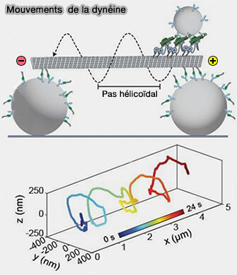 - La dynéine génère une motilité hélicoïdale à préférence nette pour le déplacement le long d'un chemin hélicoïdal à droite, ce qui pourrait être expliqué par les interactions des domaines moteurs daans les complexes (