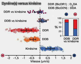 - Le recrutement d'une deuxième dynéine déplace l'équilibre des forces vers la dynéine et facilite un transport plus rapide vers l'extrémité (-) des cargos in vitro (Bicaudal D Family Adaptor Proteins Control the Velocity of Dynein-Based Movements 2014).
