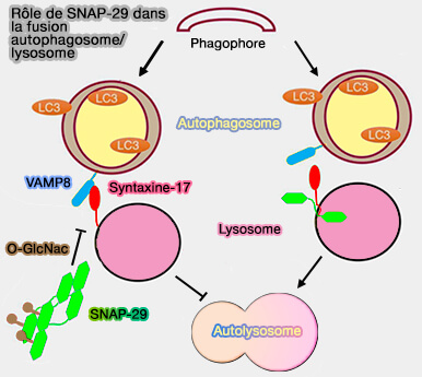 - Lors de famine, les niveaux d'O-GlcNAcylation sur SNAP-29 sont réduits et SNAP-29 non modifié forme un complexe plus stable avec STX17 et VAMP8 pour assurer la médiation de la fusion autophagosome-lysosome.