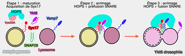 Remarque : chez la drosophile, Ykt6, localisé dans les lysosomes, est capable de former un complexe SNARE avec Syx17-Snap-29, jusqu'à la participation de Vamp7, qui remplace Ykt6 dans le complexe SNARE définitif, i.e. il agit plutôt comme un régulateur que comme un élément de machinerie de fusion (Non-canonical role of the SNARE protein Ykt6 in autophagosome-lysosome fusion 2018).