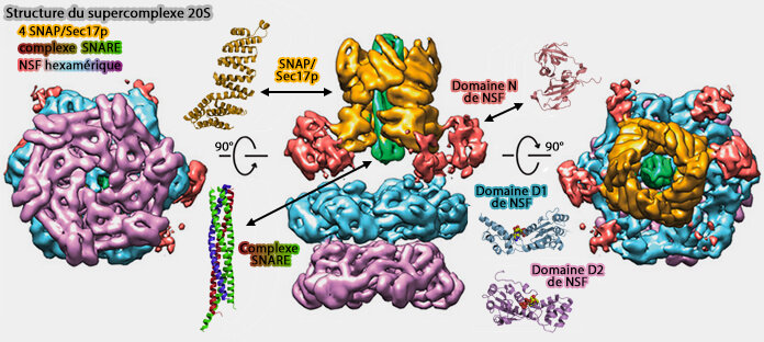Les quatre molécules α-SNAP s'enroulent autour du complexe SNARE dans un arrangement de rotation symétrique, malgré le fait que le complexe SNARE lui-même n'est que pseudo-symétrique, i.e. les quatre hélices α sont constituées de différentes chaînes peptidiques.