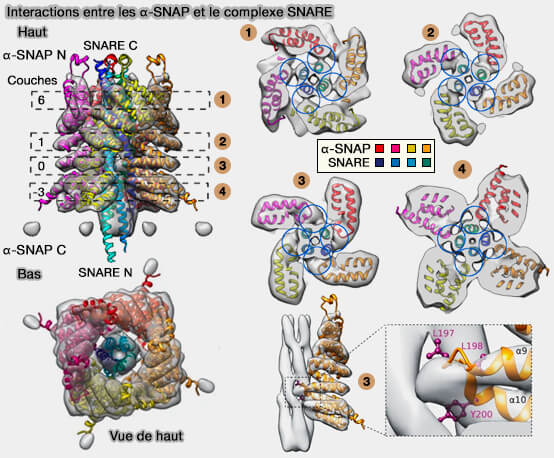 Chaque α-SNAP interagit avec trois des quatre chaînes du complexe SNARE, et ce par un ensemble identique de résidus.