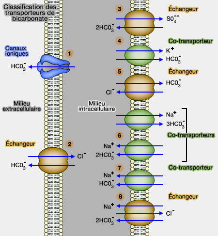 Le transport du bicarbonate (HCO3-) est effectué par huit processus physiologiquement distincts chez les animaux.
