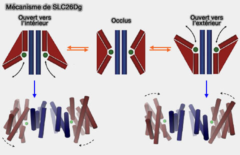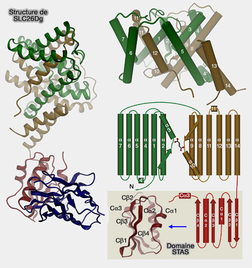 (Figure : vetopsy.fr avec l'autorisation de Dutzler et coll) SLC26A4 (pendrine), échangeur HCO3-/Cl-, mais aussi, I-, formate, nitrate et SCN-, exprimé principalement dans l'oreille interne et l'oreille moyenne ;