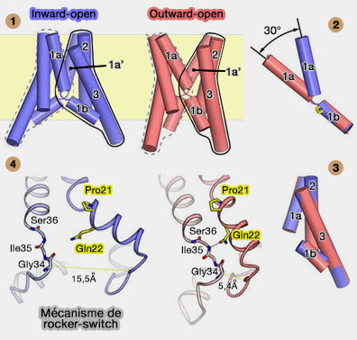 1. Le mécanisme le plus simple de rocker-switch correspond à des mouvements rigides de deux faisceaux, liés de manière symétrique autour d'un site de liaison de substrat situé au centre (Structural advances for the major facilitator superfamily (MFS) transporters 2013 et Substrate-induced changes in the structural properties of LacY 2014).