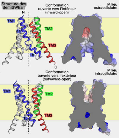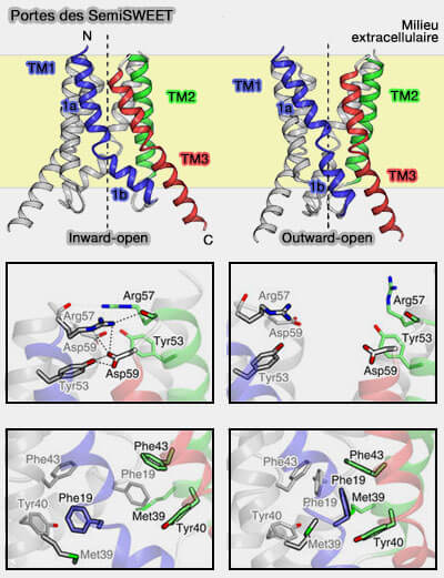 - Les deux portes, extracellulaire et intracellulaire, sont fermées chez L. biflexa SemiSWEET (LbSemiSWEET), dans lequel les résidus décrits précédemment sont complètement conservés.