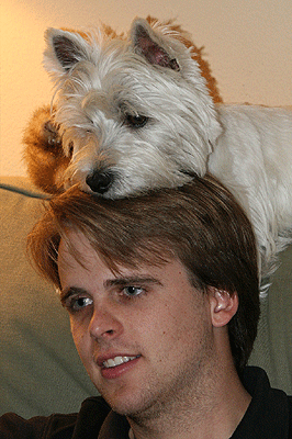 - Un chien de petite race, comme le Westie sur la photo ci-contre, se couchera sur le dossier du fauteuil du maître.tandis
