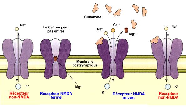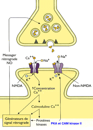 - Si le potentiel membranaire postsynaptique est bas (- 30 mV), le glutamate provoquent non seulement l'ouverture de nombreux récepteurs ionotropes AMPA de glutamate, mais également, l'expulsion des ions Mg++ des récepteurs NMDA, ce qui permet une entrée massive du Ca++ dans la cellule postsynaptique.