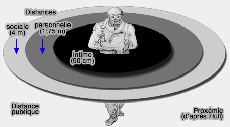 Chez l'Homme, Edward T. Hall a défini 4 distances qui définissent des espaces :