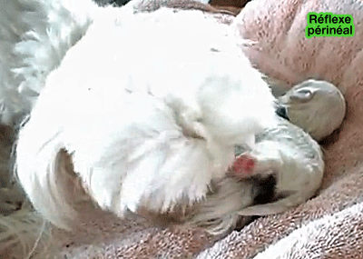 Pour déclencher le réflexe périnéal, la chienne retourne ses chiots pour les mettre sur le dos afin de pouvoir les stimuler plus efficacement, quelquefois sans ménagement comme dans le film ci-contre.