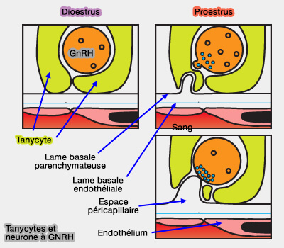 - De plus, les tanycytes peuvent changer de forme selon l'état hormonal et peuvent séparer les terminaisons axonales des capillaires du système porte : les terminaisons nerveuses étaient observées au contact des capillaires ou en étaient séparés par des prolongements gliaux selon l'état stéroïdien des animaux. Des jonctions neuro-hémales ne sont visibles que le jour du prooestrus au moment où l'on observe le pic de GnRH dans le sang porte (