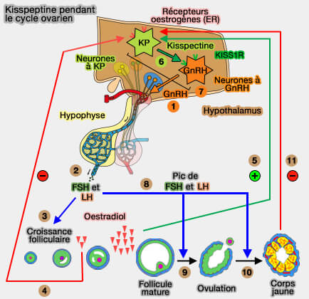 À la fin de la phase folliculaire, lorsque le follicule principal devient dominant et atteint environ 12 mm, le niveau d'oestradiol augmente et stimule les récepteurs à l'oestradiol (ER) des neurones à kisspeptine (Kp) pour libérer la kisspeptine.