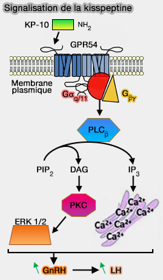 Lorsque la kisspeptine stimule son récepteur, le Gq/11 active la phospholipase C (PLCβ) qui hydrolyse le phosphatidylionositol 4,5-bisphosphate (PIP2) produisant des seconds messagers.