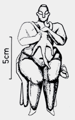 - En Anatolie, à Hacilar, des statuettes datées du 6ème millénaire représentent des déesses-mères, tenant un petit carnivore à longue queue dans les bras : est-ce un chat ? Cela pourrait être aussi une mangouste.