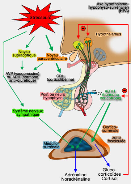 Les glandes surrénales, glandes endocrines situées au-dessus des reins, sont des glandes endocrines qui produisent diverses hormones.