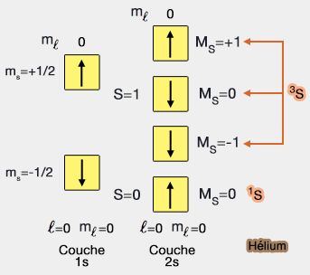- le spin, par exemple, est calculé (en notation bra-ket) par : $\vert\psi\rangle=\dfrac {1}{\sqrt 2}\bigg(\vert\uparrow\downarrow\rangle-|\downarrow\uparrow\rangle\bigg)$ qui implique la superposition des états de spin communs pour deux particules de spin 1/2 (fermions)