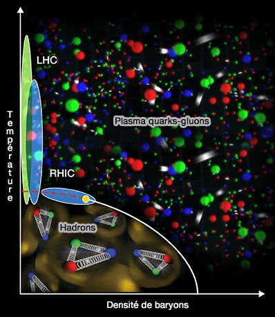 - Le QGP se comporte comme un liquide plutôt que comme un gaz, et les études continuent dans le LHC (grand collisionner de hadrons ou Large Hadron Collider) par l'expérience ALICE (